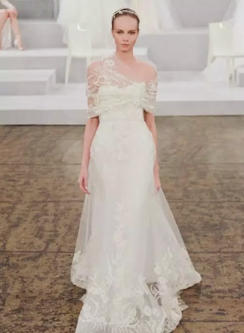 Monique Lhuillier lace shawl with simple skirt is over than full lace wedding dress, in sometimes to make your wedding "breathe", it maybe a good thing.